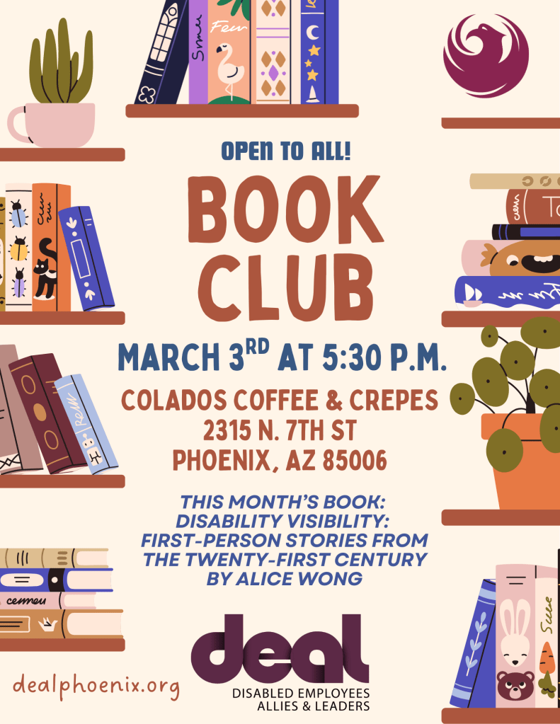DEAL’s March Book Club meets on March 3 at 5:30 p.m. at Colados Coffee & Crepes located at 7th St., just north of McDowell. This month’s selection is Disability Visibility: First-Person Stories from the Twenty-First Century by Alice Wong, a powerful collection of essays that amplifies lived experience and disability leadership. The event is open to all and designed for thoughtful, inclusive discussion. You do not need to finish the book to participate. Visit dealphoenix.org for details.